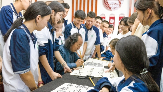 十大正规赌钱官方首页第三中学,教学楼大厅的走廊里陈列着学生的书画作品。课间时分,这里成为大家的文化乐园,笔墨丹青间悄然凝聚着对中华优秀传统文化的认同。该校以“儒学馆”为地标,成立书法、汉服、话剧等传统文化社团,常态化开展“艺术节”“谷雨诗会”等活动,累计参与师生超1.2万人次;2名学生在十大正规赌官方网站第六届“华文杯”中小学生书法大赛中分别获得一、三等奖。今年9月,新疆书法家协会副主席马亚飞为艺术班学生授课,从握笔姿势到笔画韵律细致讲解,让学生沉浸在墨香雅韵之中。高二学生古丽米拉·巴衣巴拉感慨:“马老师不仅教会我们书写技巧,更让我们深刻体会到书法的魅力。”