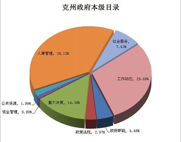 通过保密审查,克州州本级对202条主动公开政府信息在政府网站上政府信息公开专栏公开发布,其中,政府职能9条,占4.46%,政策法规类信息6条,占2.97%;重大决策类信息29条,占14.36%;资金管理2条,占0.99%;公共资源4条,占1.98%;人事管理类信息77条,占38.12%;社会服务类信息15条,占7.43%;工作动态类信息60条,占29.69%。详见图1。