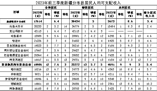 (一)居民收入水平在全区排名情况。前三季度,克州全体居民人均可支配收入绝对值居全区第12位,增速居全区第3位、南疆第1位;城镇居民人均可支配收入绝对值居全区第13位、南疆第3位,增速居全区第5位、南疆第1位;农村居民人均可支配收入绝对值居全区第9位、南疆第1位,增速居全区第3位、南疆第1位。城乡居民收入比5.4:1,均小于南疆四地州。(见附表)