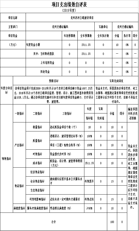 项目一:克州农村公路建设项目,涉及资金0万元。预算绩效管理取得的成效:促进当地经济社会发展,加快沿线及周边地区脱贫致富具有十分重要的作用。发现的问题及原因:预算调整数较大,预决算存在巨大偏差。下一步改进措施:将继续改进完善绩效监控过程,绩效监控与预算计划环节、实施过程及后续的绩效评价形成连贯性,提高绩效管理效果质量。具体项目自评情况附项目支出绩效自评表。