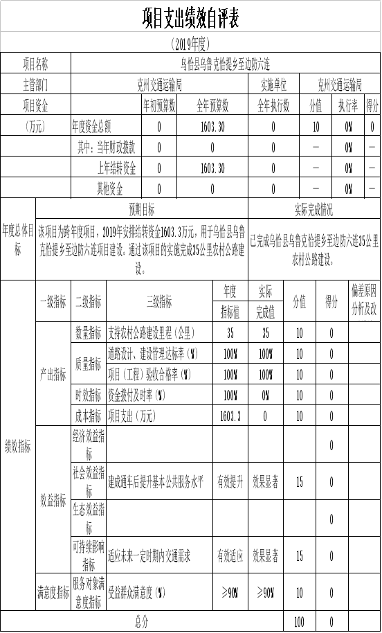 项目三:乌恰县乌鲁克恰提乡-边防六连,涉及资金0万元。预算绩效管理取得的成效:农村公路项目建设,加快沿线及周边村落脱贫致富促进当地经济社会发展,发现的问题及原因:预算调整数较大,预决算存在巨大偏差。下一步改进措施:将继续改进完善绩效监控过程,绩效监控与预算计划环节、实施过程及后续的绩效评价形成连贯性,提高绩效管理效果质量。具体项目自评情况附项目支出绩效自评表。