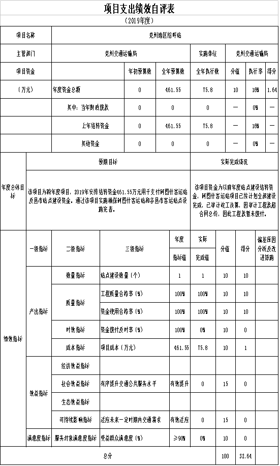 项目六:克州地区招呼站,涉及资金0万元。预算绩效管理取得的成效:改善建制村客运出行条件,提高群众出安全保障,对加快农村脱贫致富具有十分重要的作用。发现的问题及原因:预算调整数较大,预决算存在偏差。下一步改进措施:将继续改进完善绩效监控过程,绩效监控与预算计划环节、实施过程及后续的绩效评价形成连贯性,提高绩效管理效果质量。具体项目自评情况附项目支出绩效自评表。