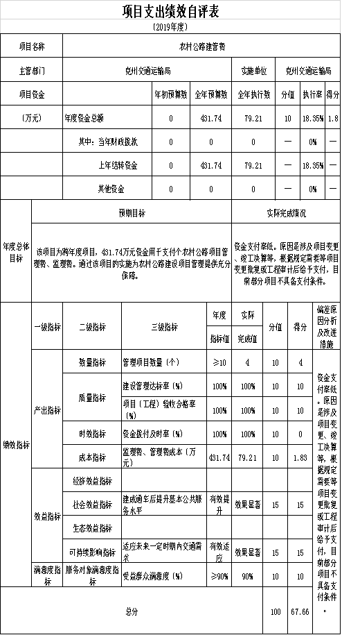 项目四:克州农村公路养护项目,涉及资金318.09万元。预算绩效管理取得的成效:公路养护项目的建设对减少乡村交通事故,提高运输效率,保证人民生命财产安全,促进当地经济社会发展,加快沿线及周边地区脱贫致富具有十分重要的作用。发现的问题及原因:预算调整数较大,预决算存在偏差。下一步改进措施:将继续改进完善绩效监控过程,绩效监控与预算计划环节、实施过程及后续的绩效评价形成连贯性,提高绩效管理效果质量。具体项目自评情况附项目支出绩效自评表。