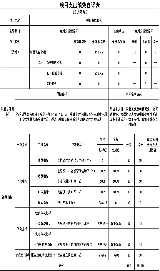 项目七:偏远农村客运以奖代补,涉及资金0万元。预算绩效管理取得的成效:改善县市客运出行条件,提高交通运输安全保障,促进当地交通基础设施建设。发现的问题及原因:预算调整数较大,预决算存在偏差。下一步改进措施:将继续改进完善绩效监控过程,绩效监控与预算计划环节、实施过程及后续的绩效评价形成连贯性,提高绩效管理效果质量。具体项目自评情况附项目支出绩效自评表。