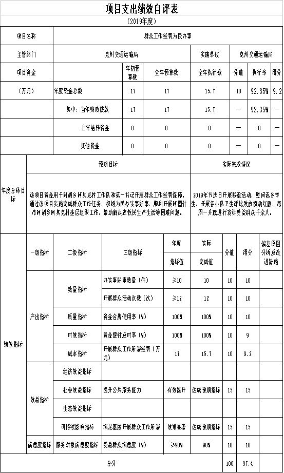 项目十五:群众工作经费为民办事,涉及资金15.7万元。预算绩效管理取得的成效:一是为阿图什市阿湖乡阿其克村群众办实事好事,解决家庭实际困难、开展各类培训和活动提供有效保障;二是助力阿其克村打赢脱贫攻坚战。发现的问题及原因:资金用于补助和慰问困难家庭较多。下一步改进措施:将科学合理安排使用资金,提高资金效率,确保绩效管理效果质量。具体项目自评情况附项目支出绩效自评表。