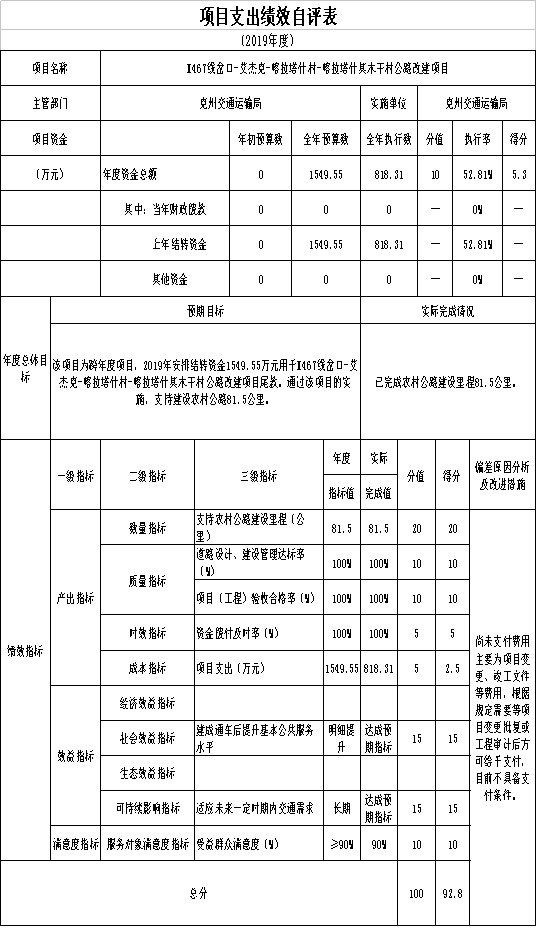 项目十九:X467线岔口-艾杰克村-喀拉塔什村-喀拉塔什其木干村公路改建项目,涉及资金818.31万元。预算绩效管理取得的成效:用于建设阿克陶县81.5公里农村公路,改善当地群众出行条件,促进当地经济社会发展,加快沿线及周边地区脱贫致富。发现的问题及原因:预算调整数较大,预决算存在巨大偏差。下一步改进措施:将继续改进完善绩效监控过程,绩效监控与预算计划环节、实施过程及后续的绩效评价形成连贯性,提高绩效管理效果质量。具体项目自评情况附项目支出绩效自评表。