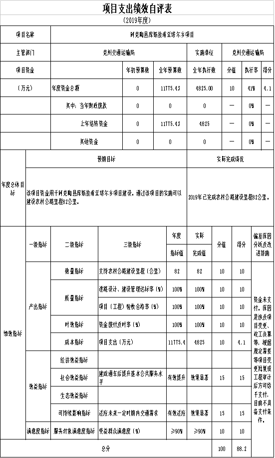 项目二十:阿克陶县库斯拉甫至塔尔乡项目,涉及资金4825万元。预算绩效管理取得的成效:一是用于建设阿克陶县82公里农村公路,保障贫困乡道路畅通,加快沿线及周边地区脱贫致富;二是确保全州农村公路建设固定资产投资任务顺利完成。发现的问题及原因:预算调整数较大,预决算存在巨大偏差。下一步改进措施:将继续改进完善绩效监控过程,绩效监控与预算计划环节、实施过程及后续的绩效评价形成连贯性,提高绩效管理效果质量。具体项目自评情况附项目支出绩效自评表。