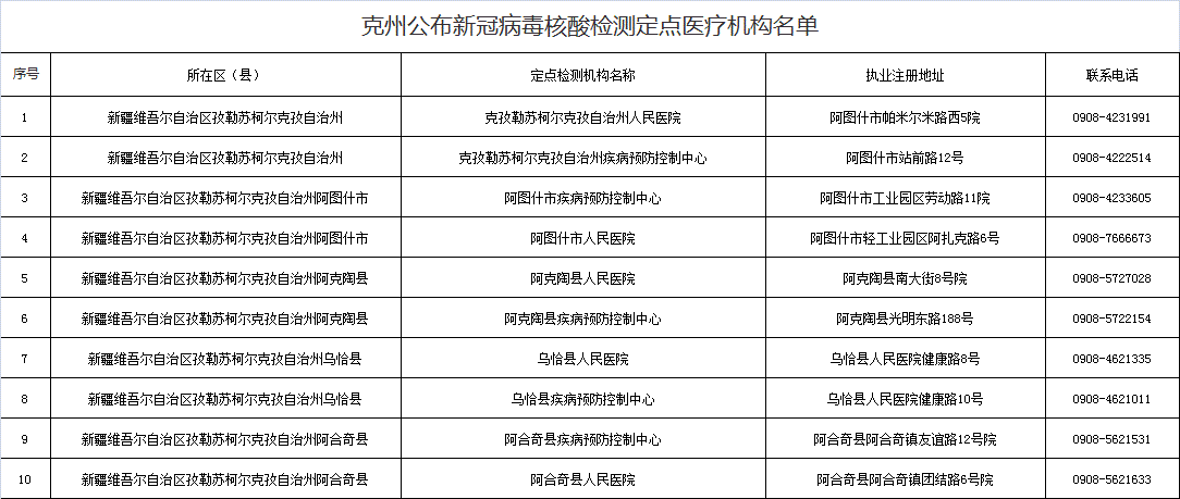 克州公布新冠病毒核酸检测定点医疗机构名单