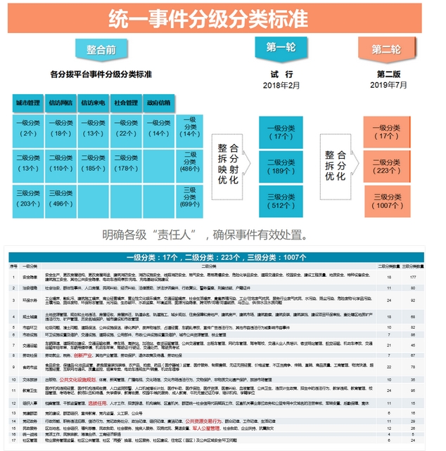 坪山区系统梳理了城管、信访、社会管理、政府信箱等事件类别,出台了《坪山区网格化管理事件分级分类标准》,各业务部门可在此标准基础上映射形成业务子集,进而打通事件分拨的统一路径,理顺区、街道、社区职能。现共有一级分类17个,二级分类223个,三级分类1007个,根据重要性及紧急性不同将所有事件进一步细分为A、B、C三类,逐一明确各级“责任人”,确保一般案件责任清晰,复杂案件迅速形成整治合力,推动落实各单位处置责任,确保事件得到有效处置。
