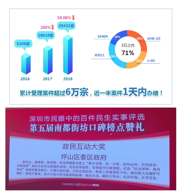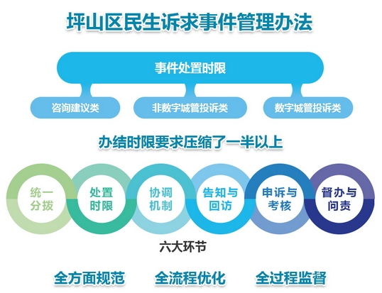 为了规范民生诉求事件的各项流程,坪山区出台了《坪山区民生诉求事件管理办法》,通过办法的修订,对事件办理时限进行了3轮压缩,部分事件处置时限压缩至原来的1/60,部分咨询问题实现“秒回”。