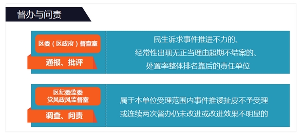 对于民生诉求事件推进不力的、经常性出现无正当理由超期不结案的、处置率整体排名靠后的责任单位,区委(区政府)督查室将予以通报、批评;对于属于本单位受理范围内事件推诿扯皮不予受理或连续两次督办仍未改进或改进效果不明显的,将提交区纪委监委党风政风监督室介入调查处理,对单位、相关人员进行问责。