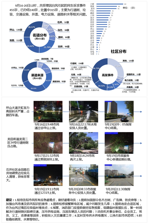 如2018年最强台风“山竹”登陆前后,共受理455宗涉及行道树、垃圾、交通设施等类型民生诉求事件,通过数据分析为各单位提出9项建议。
