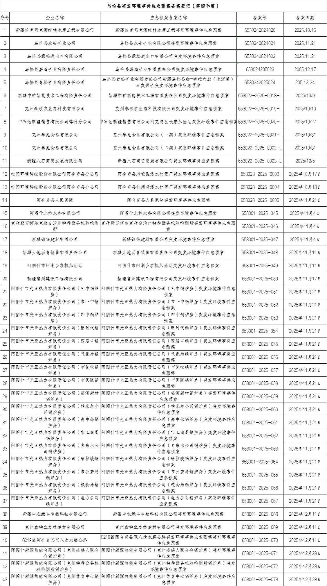 克州2025年第四季度突发环境事件应急预案备案情况
