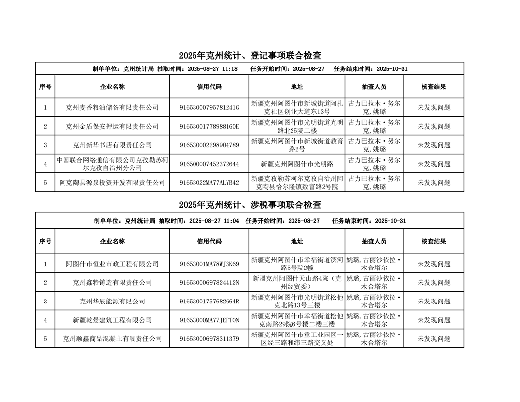 2025年克州统计局“双随机、一公开”检查结果公示