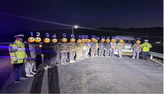 2024年12月6日20时04分许,克州阿图什市公安局交警大队在国道314线1468公里600米处开展冬季交通安全整治工作时,发现号牌为鲁B***0号小型面包车底盘下沉,隐约可见车内人头攒动,疑似存在超员违法行为,便立即上前拦停检查。当打开车门的瞬间,令民警吃惊不已,满满当当“挤”了一车人,经清点发现核载9人面包车,竟然“塞进”17人,超过核定人数88.9%,简直成了现实版“压缩包”。