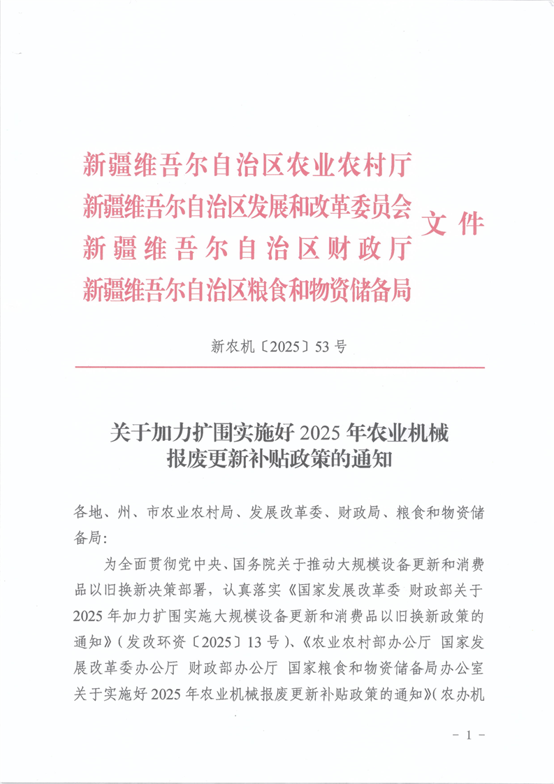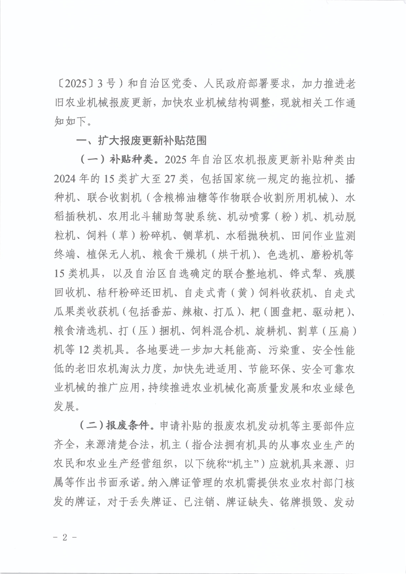 关于加大扩围实施好2025年农业机械报废更新补贴政策的通知
