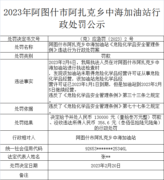 2023年阿图什市阿扎克乡中海加油站行政处罚公示 |