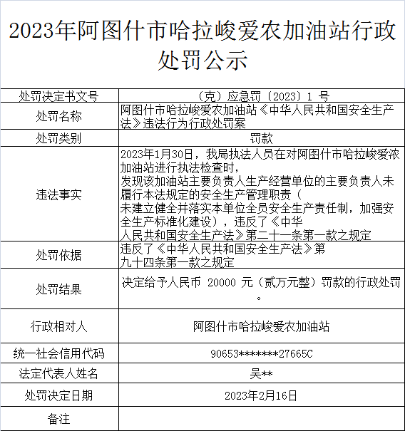 2023年阿图什市哈拉峻爱农加油站行政处罚公示 |