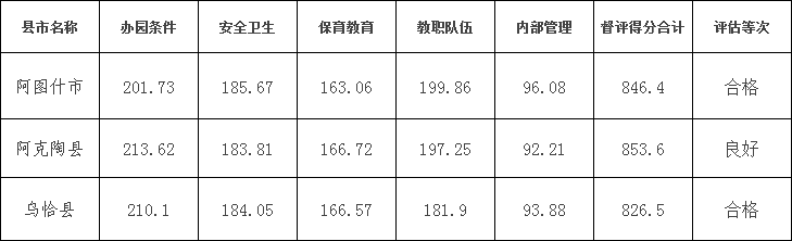 按照教育部幼儿园办园行为督导评估系统规定,督导评估总分值为1000分,其中:办园条件250分、安全卫生200分、保育教育200分、教职工队伍250分、内部管理100分。本年度阿图什市、乌恰县、阿克陶县幼儿园督评总体得分情况见下表: