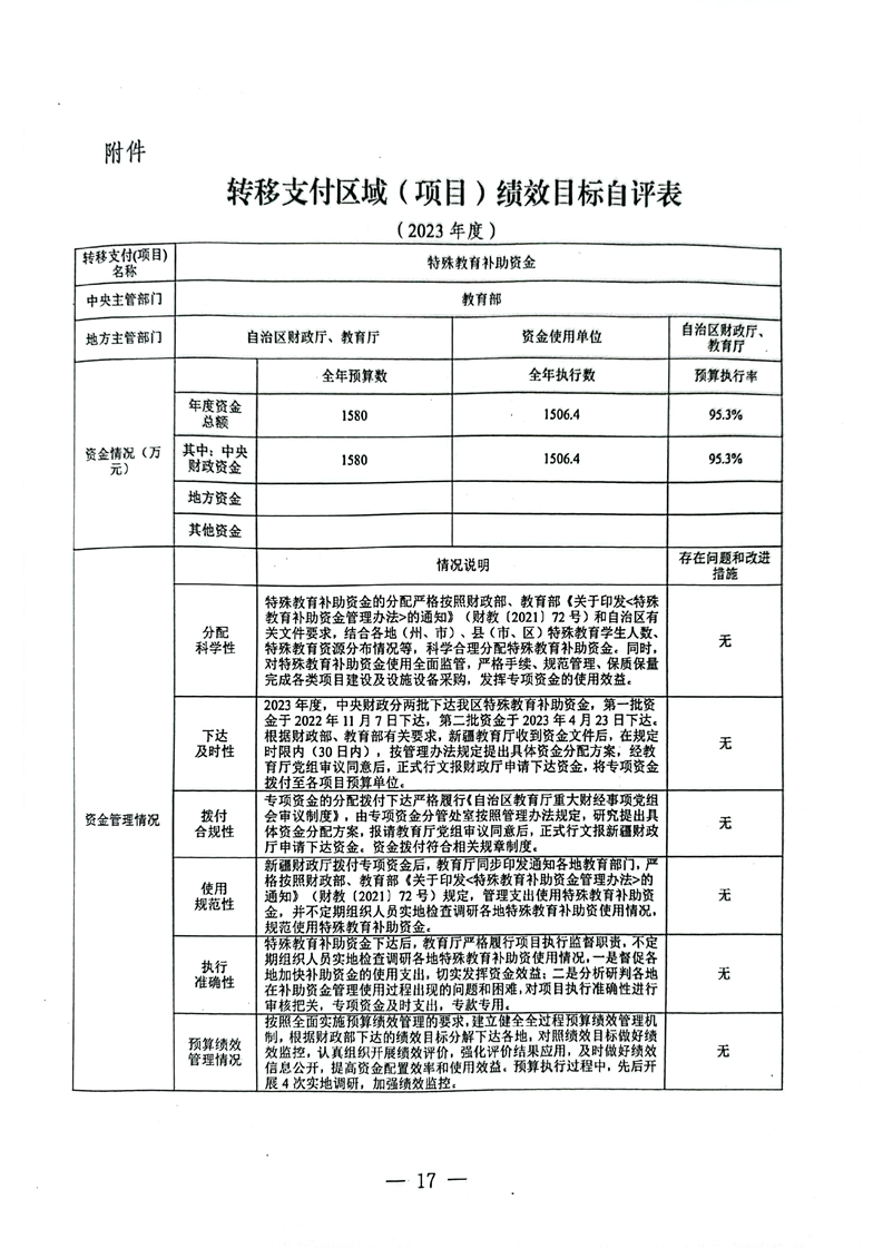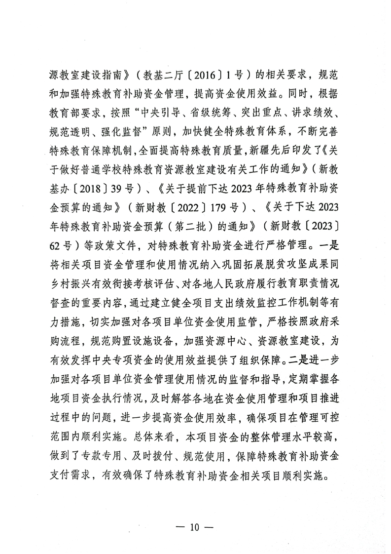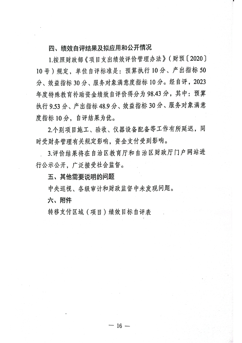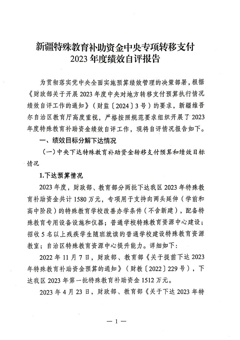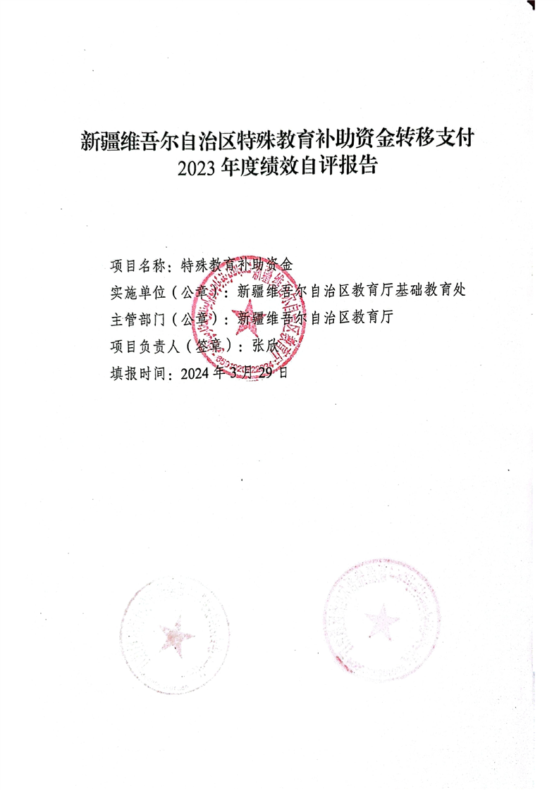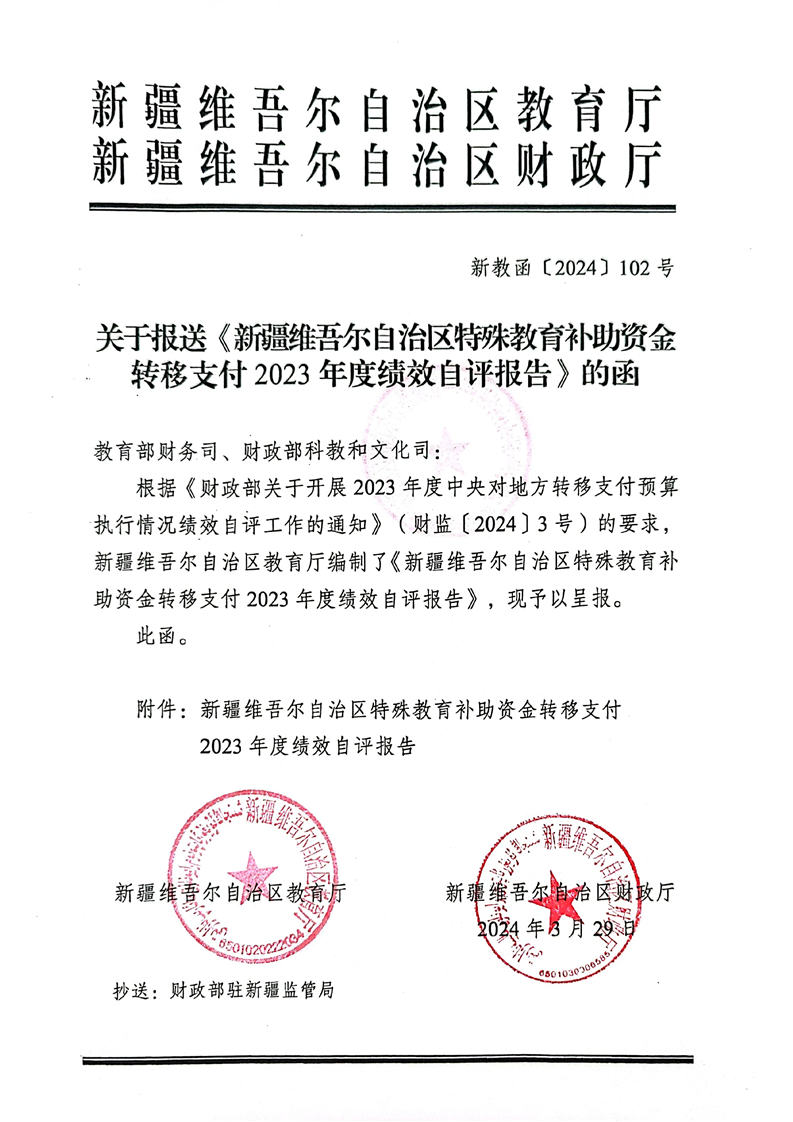 关于报送《新疆维吾尔十大正规赌官方网站特殊教育补助资金转移支付2023年度绩效自评报告》的函