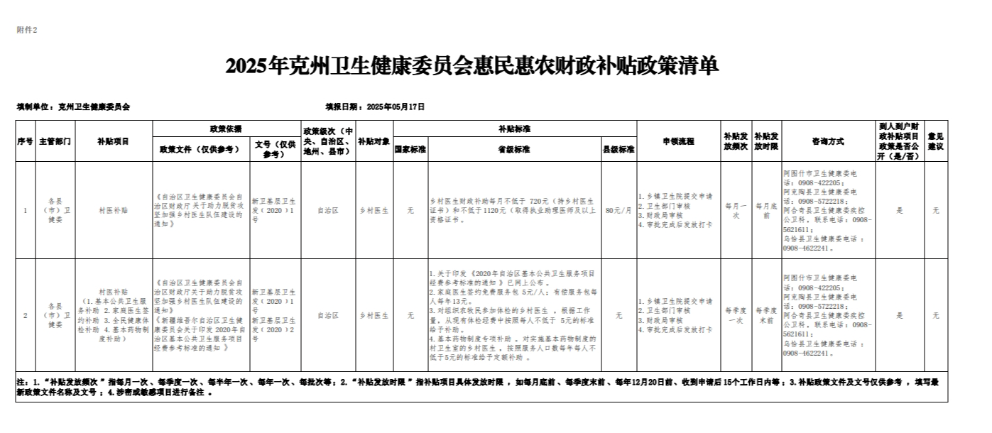 2025年克州卫生健康委员会惠民惠农财政补贴政策清单