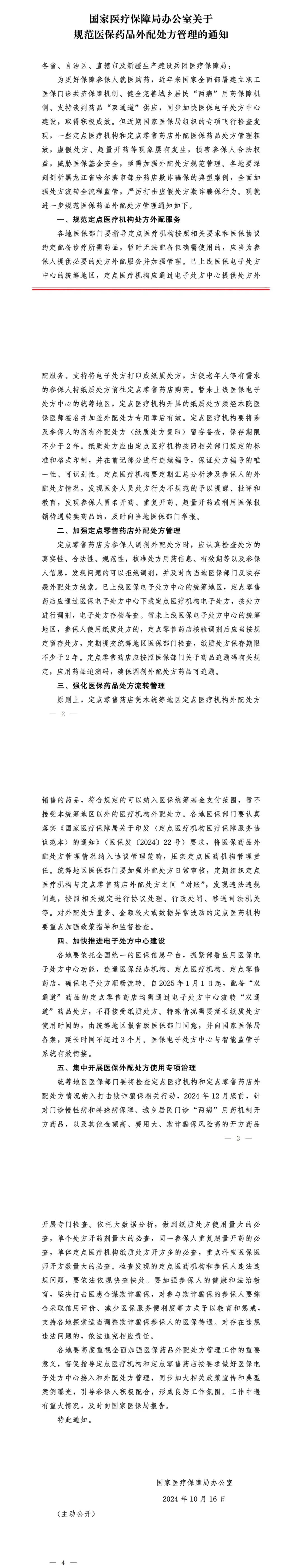 国家医疗保障局办公室关于规范医保药品外配处方管理的通知