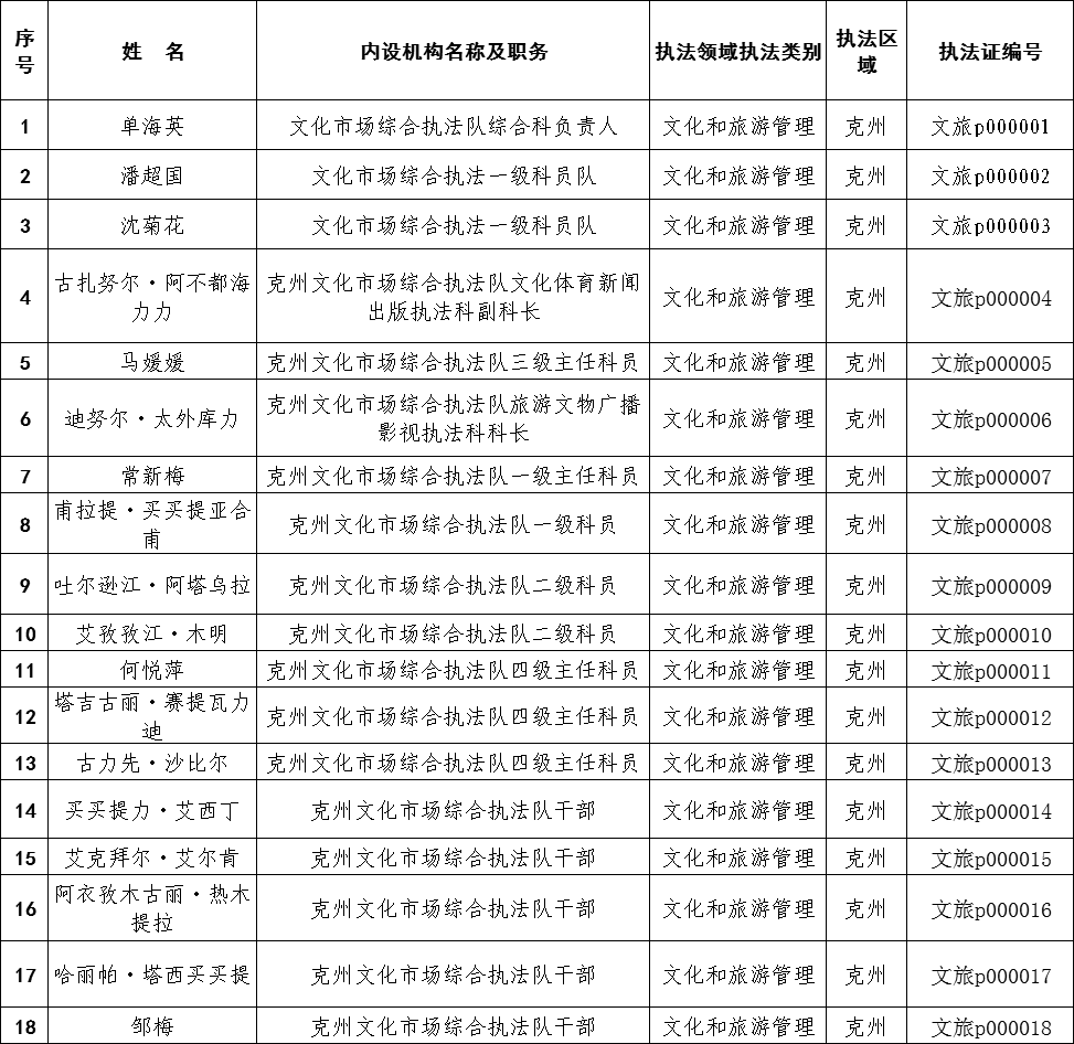 克州文化体育和旅游局执法人员名录