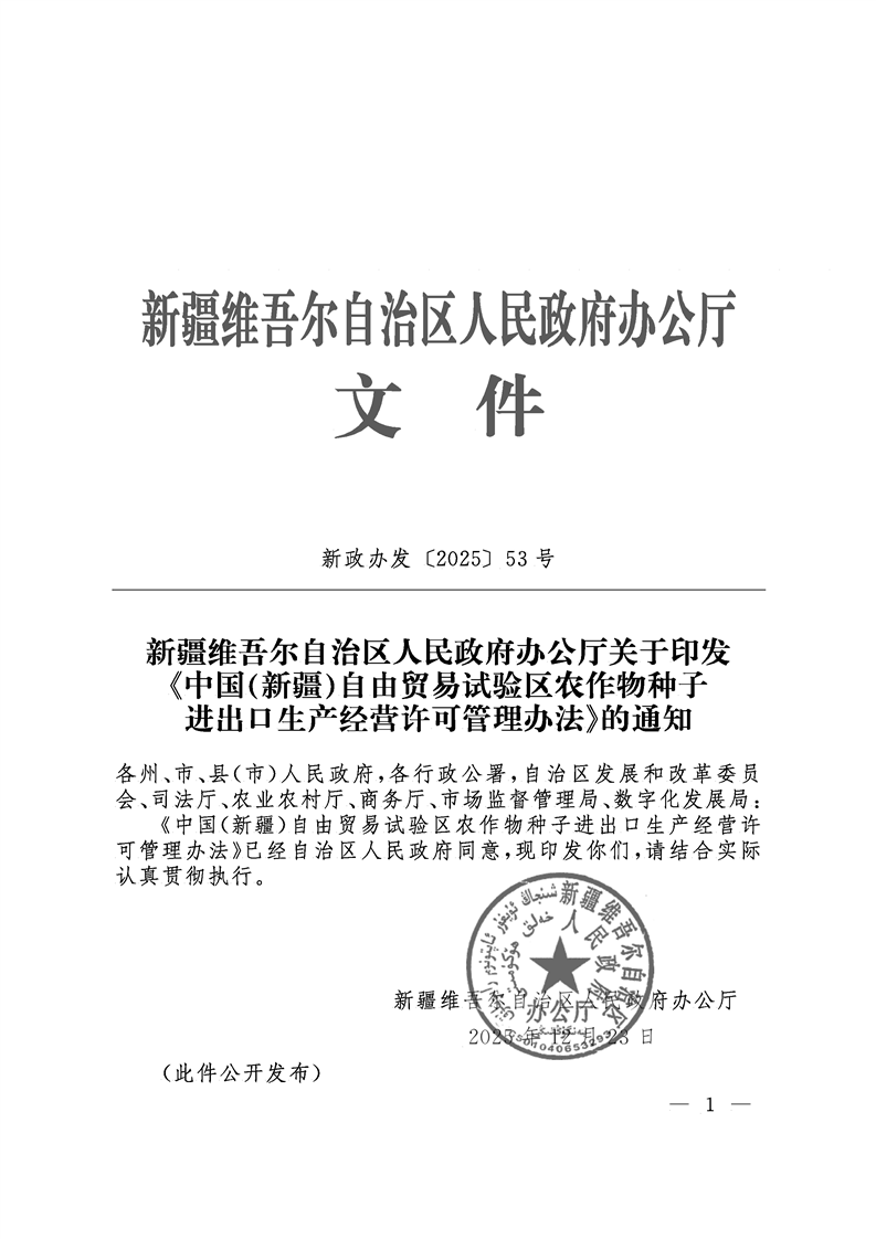 新疆维吾尔十大正规赌钱官方首页人民政府办公厅关于印发《中国(新疆)自由贸易试验区农作物种子进出口生产经营许可管理办法》的通知