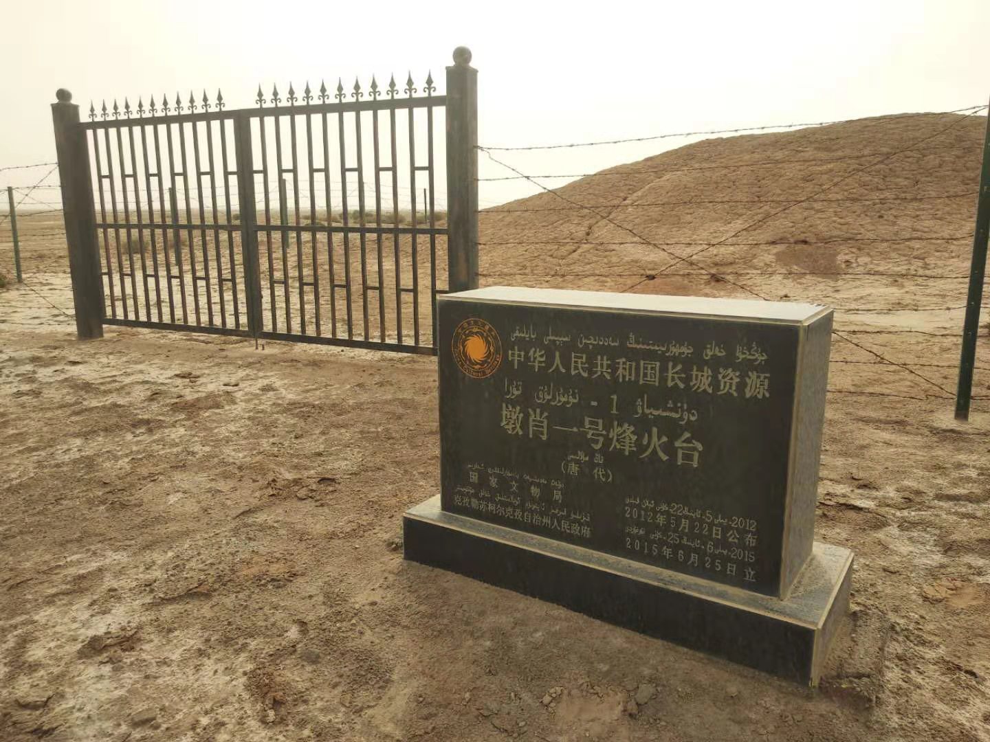 墩肖一号烽火台位于阿扎克镇库木萨克村,该烽火台遗址现呈圆丘形,为土坯砌筑而成,因风蚀严重,土坯规格不可知。现底部直径约18米,高约3米。顶部凹凸不平,直径约5米。烽火台具体年代待定。该烽火台的发现对于研究阿图什地区古代军事历史有重要价值。