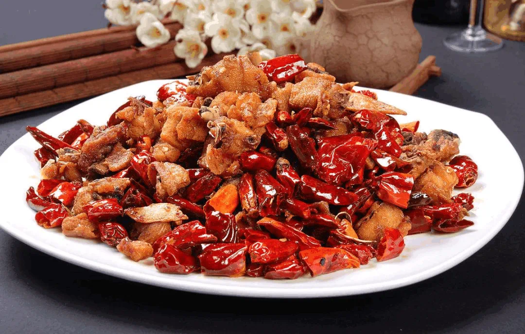辣子鸡是选用新鲜鸡肉切成小块,经过腌制后,放入热油中炸至金黄酥脆。然后在锅中留少许油,加入干辣椒、花椒等香料炒出香味,再把炸好的鸡肉块放入锅中与香料一起翻炒均匀。鸡肉外酥里嫩,麻辣味浓,辣椒的香气充分融入鸡肉中,是一道很受欢迎的下酒菜。